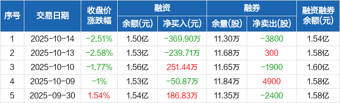 融资方面,当日融资买入1169.74万元,融资偿还1539.64万元,融资净偿还369.9万元。融券方面,融券卖出800股,融券偿还4600股,融券余量11.3万股,融券余额386.46万元。融资融券余额合计1.54亿元。
