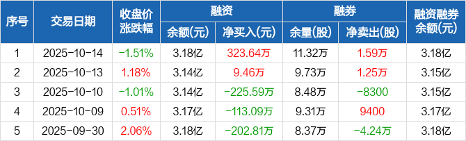 融资方面,当日融资买入955.13万元,融资偿还631.49万元,融资净买入323.64万元。融券方面,融券卖出2.03万股,融券偿还4400股,融券余量11.32万股,融券余额66.67万元。融资融券余额合计3.18亿元。