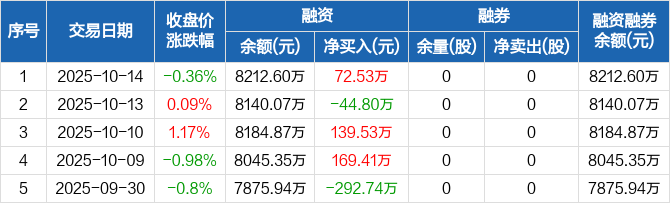 融资方面,当日融资买入314.77万元,融资偿还242.24万元,融资净买入72.53万元。融券方面,融券卖出0股,融券偿还0股,融券余量0股,融券余额0元。融资融券余额合计8212.6万元。