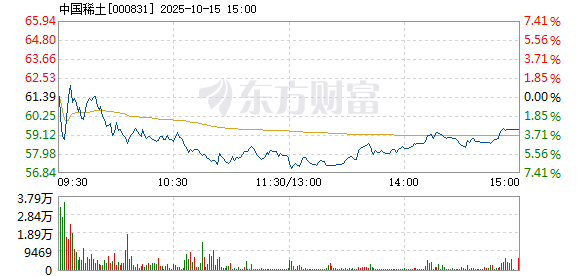 中国稀土盘中快速反弹,5分钟内涨幅超过2%,截至9点35分,报61.42元,成交8.53亿元,换手率1.34%。