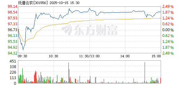 托普云农盘中快速反弹,5分钟内涨幅超过2%,截至9点42分,报96.58元,成交1609.99万元,换手率0.87%。