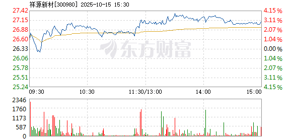 祥源新材盘中快速反弹,5分钟内涨幅超过2%,截至9点44分,报26.79元,成交2566.75万元,换手率0.98%。