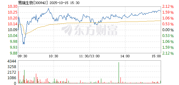 易瑞生物盘中快速反弹,5分钟内涨幅超过2%,截至9点44分,报10.16元,成交1352.51万元,换手率0.33%。