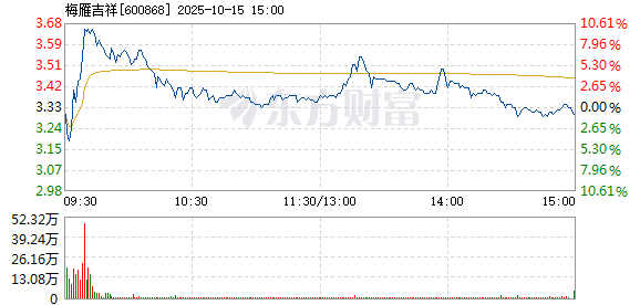 梅雁吉祥盘中快速回调,5分钟内跌幅超过2%,截至9点45分,报3.56元,成交9.72亿元,换手率14.73%。
