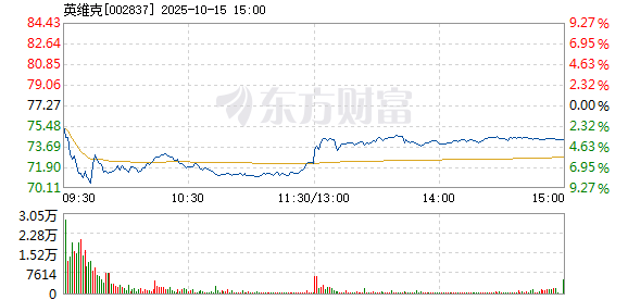 英维克盘中快速反弹,5分钟内涨幅超过2%,截至9点45分,报73.01元,成交17.93亿元,换手率2.91%。