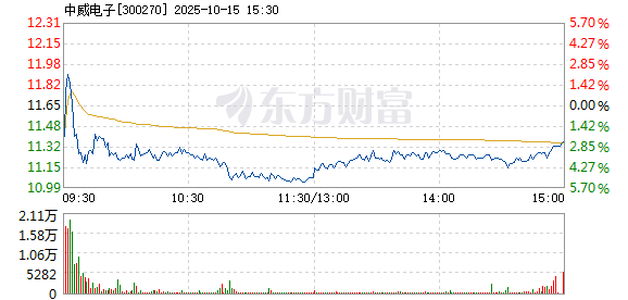中威电子盘中快速反弹,5分钟内涨幅超过2%,截至9点45分,报11.48元,成交1.57亿元,换手率5.20%。