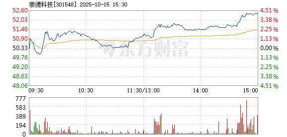 崇德科技盘中快速反弹,5分钟内涨幅超过2%,截至9点46分,报51.07元,成交1342.76万元,换手率1.02%。