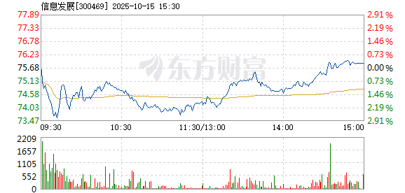 信息发展盘中快速反弹,5分钟内涨幅超过2%,截至9点46分,报75.14元,成交1.24亿元,换手率0.67%。