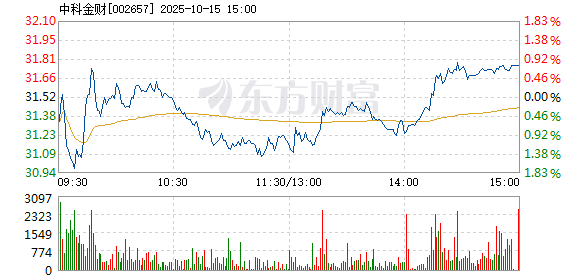 中科金财盘中快速反弹,5分钟内涨幅超过2%,截至9点46分,报31.7元,成交8740.71万元,换手率0.83%。
