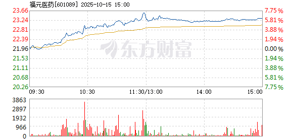 10月15日,福元医药盘中涨幅达5%,截至10点47分,报23.06元,成交9658.10万元,换手率0.89%。