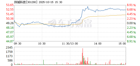 珠城科技盘中涨幅达5%,截至13点26分,报51.8元,成交6532.02万元,换手率3.49%。