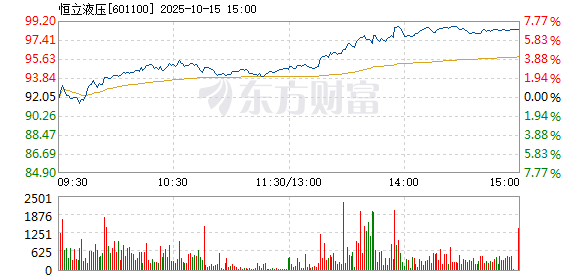 10月15日,恒立液压盘中涨幅达5%,截至13点30分,报96.7元,成交7.05亿元,换手率0.56%。