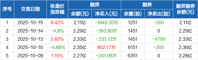 融资方面,当日融资买入1936.05万元,融资偿还3785.4万元,融资净偿还1849.35万元,连续3日净偿还累计2476.26万元。融券方面,融券卖出0股,融券偿还200股,融券余量1251股,融券余额5.62万元。融资融券余额合计2.11亿元。