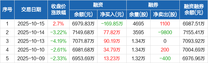 融资方面,当日融资买入205.4万元,融资偿还375.25万元,融资净偿还169.85万元。融券方面,融券卖出2200股,融券偿还1100股,融券余量4695股,融券余额7.68万元。融资融券余额合计6987.51万元。