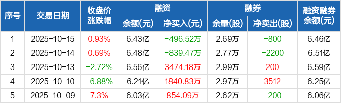 融资方面,当日融资买入1803.5万元,融资偿还2300.02万元,融资净偿还496.52万元。融券方面,融券卖出200股,融券偿还1000股,融券余量2.69万股,融券余额307.25万元。融资融券余额合计6.46亿元。