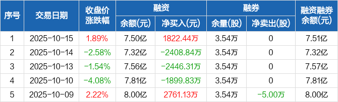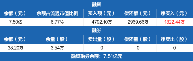 融资方面,当日融资买入4792.1万元,融资偿还2969.66万元,融资净买入1822.44万元。融券方面,融券卖出0股,融券偿还0股,融券余量3.54万股,融券余额38.2万元。融资融券余额合计7.51亿元。