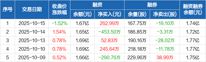 融资方面,当日融资买入1245.91万元,融资偿还982.92万元,融资净买入262.99万元。融券方面,融券卖出2.29万股,融券偿还21.39万股,融券余量167.75万股,融券余额652.55万元。融资融券余额合计1.74亿元。