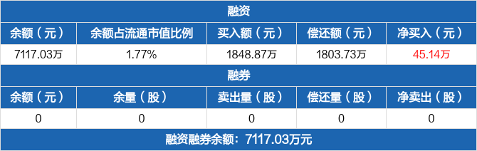 融资方面,当日融资买入1848.87万元,融资偿还1803.73万元,融资净买入45.14万元。融券方面,融券卖出0股,融券偿还0股,融券余量0股,融券余额0元。融资融券余额合计7117.03万元。