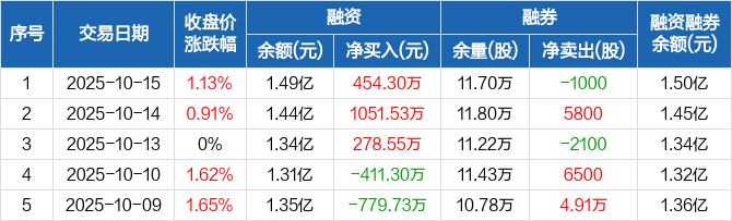 融资方面,当日融资买入1053.89万元,融资偿还599.59万元,融资净买入454.3万元,连续3日净买入累计1784.39万元。融券方面,融券卖出100股,融券偿还1100股,融券余量11.7万股,融券余额52.3万元。融资融券余额合计1.5亿元。