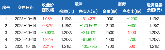融资方面,当日融资买入648.98万元,融资偿还497.56万元,融资净买入151.42万元。融券方面,融券卖出0股,融券偿还1200股,融券余量900股,融券余额9747元。融资融券余额合计1.19亿元。