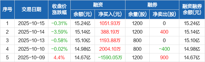 融资方面,当日融资买入3001.83万元,融资偿还1949.9万元,融资净买入1051.93万元,连续4日净买入累计4638.11万元。融券方面,融券卖出0股,融券偿还0股,融券余量1200股,融券余额6.56万元。融资融券余额合计15.24亿元。