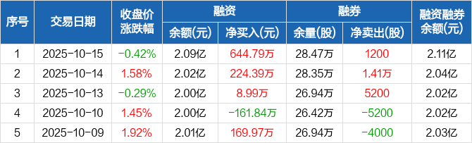 融资方面,当日融资买入1255.09万元,融资偿还610.3万元,融资净买入644.79万元,连续3日净买入累计878.17万元。融券方面,融券卖出2100股,融券偿还900股,融券余量28.47万股,融券余额200.71万元。融资融券余额合计2.11亿元。