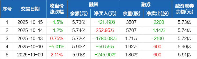 融资方面,当日融资买入1883.39万元,融资偿还2004.88万元,融资净偿还121.49万元。融券方面,融券卖出1200股,融券偿还3400股,融券余量3507股,融券余额11.99万元。融资融券余额合计5.73亿元。