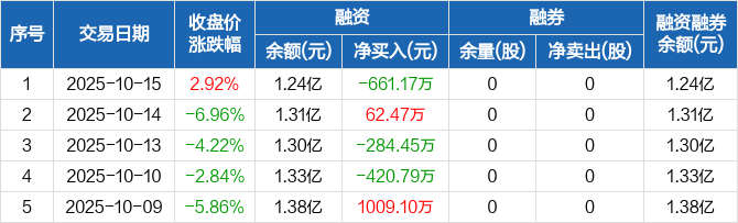 融资方面,当日融资买入910.61万元,融资偿还1571.78万元,融资净偿还661.17万元。融券方面,融券卖出0股,融券偿还0股,融券余量0股,融券余额0元。融资融券余额合计1.24亿元。