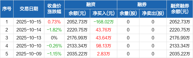 融资方面,当日融资买入89.81万元,融资偿还257.83万元,融资净偿还168.02万元。融券方面,融券卖出0股,融券偿还0股,融券余量0股,融券余额0元。融资融券余额合计2052.73万元。