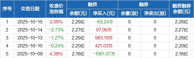 融资方面,当日融资买入742.52万元,融资偿还805.76万元,融资净偿还63.24万元。融券方面,融券卖出0股,融券偿还0股,融券余量0股,融券余额0元。融资融券余额合计2.26亿元。