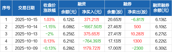 融资方面,当日融资买入784.01万元,融资偿还412.81万元,融资净买入371.21万元。融券方面,融券卖出1200股,融券偿还6.93万股,融券余量20.65万股,融券余额161.69万元。融资融券余额合计6.13亿元。