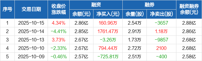 融资方面,当日融资买入1687.16万元,融资偿还1526.2万元,融资净买入160.96万元。融券方面,融券卖出3300股,融券偿还6957股,融券余量2.54万股,融券余额134.44万元。融资融券余额合计2.88亿元。