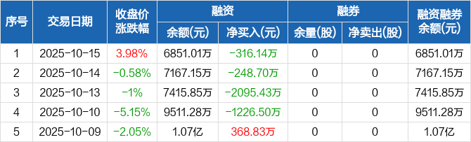 融资方面,当日融资买入208.23万元,融资偿还524.37万元,融资净偿还316.14万元,连续4日净偿还累计3886.77万元。融券方面,融券卖出0股,融券偿还0股,融券余量0股,融券余额0元。融资融券余额合计6851.01万元。