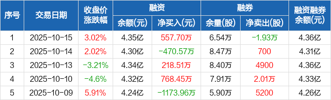 融资方面,当日融资买入4914.01万元,融资偿还4356.31万元,融资净买入557.7万元。融券方面,融券卖出9200股,融券偿还2.85万股,融券余量6.54万股,融券余额115.95万元。融资融券余额合计4.36亿元。