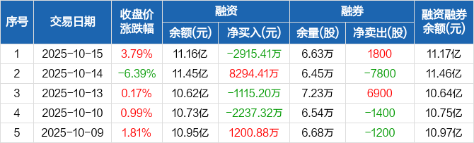 融资方面,当日融资买入6044.89万元,融资偿还8960.3万元,融资净偿还2915.41万元。融券方面,融券卖出7500股,融券偿还5700股,融券余量6.63万股,融券余额190.68万元。融资融券余额合计11.17亿元。