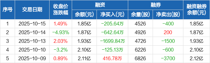 融资方面,当日融资买入1135.14万元,融资偿还1340.78万元,融资净偿还205.64万元,连续4日净偿还累计2673.24万元。融券方面,融券卖出0股,融券偿还400股,融券余量4526股,融券余额19.13万元。融资融券余额合计1.85亿元。