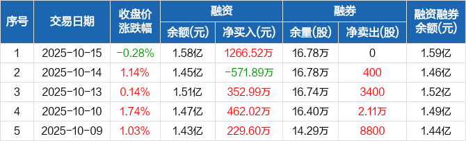 融资方面,当日融资买入1870.29万元,融资偿还603.77万元,融资净买入1266.52万元。融券方面,融券卖出300股,融券偿还300股,融券余量16.78万股,融券余额118.8万元。融资融券余额合计1.59亿元。