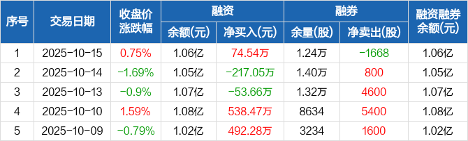 融资方面,当日融资买入481.82万元,融资偿还407.28万元,融资净买入74.54万元。融券方面,融券卖出0股,融券偿还1668股,融券余量1.24万股,融券余额21.68万元。融资融券余额合计1.06亿元。