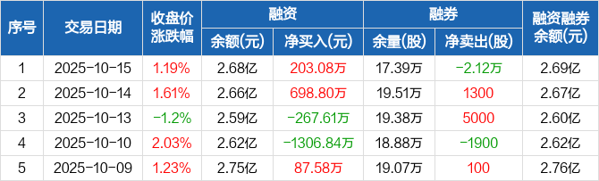 融资方面,当日融资买入949.18万元,融资偿还746.11万元,融资净买入203.08万元。融券方面,融券卖出0股,融券偿还2.12万股,融券余量17.39万股,融券余额44.34万元。融资融券余额合计2.69亿元。