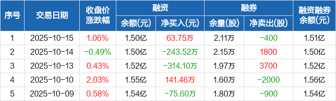 融资方面,当日融资买入692.17万元,融资偿还628.42万元,融资净买入63.75万元。融券方面,融券卖出200股,融券偿还600股,融券余量2.11万股,融券余额30.05万元。融资融券余额合计1.51亿元。