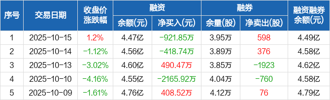 融资方面,当日融资买入5514.48万元,融资偿还6436.33万元,融资净偿还921.85万元。融券方面,融券卖出1998股,融券偿还1400股,融券余量3.95万股,融券余额233.66万元。融资融券余额合计4.49亿元。