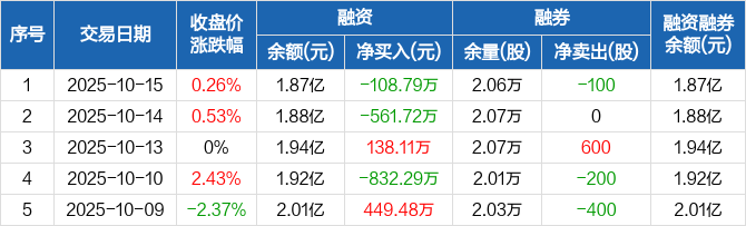 融资方面,当日融资买入531.42万元,融资偿还640.21万元,融资净偿还108.79万元。融券方面,融券卖出0股,融券偿还100股,融券余量2.06万股,融券余额7.89万元。融资融券余额合计1.87亿元。