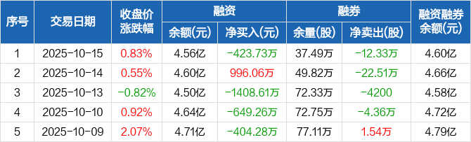 融资方面,当日融资买入1209.74万元,融资偿还1633.47万元,融资净偿还423.73万元。融券方面,融券卖出5200股,融券偿还12.85万股,融券余量37.49万股,融券余额412.04万元。融资融券余额合计4.6亿元。