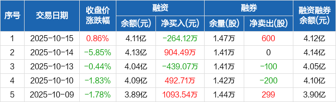 融资方面,当日融资买入571.49万元,融资偿还835.62万元,融资净偿还264.12万元。融券方面,融券卖出600股,融券偿还0股,融券余量1.47万股,融券余额101.62万元。融资融券余额合计4.12亿元。