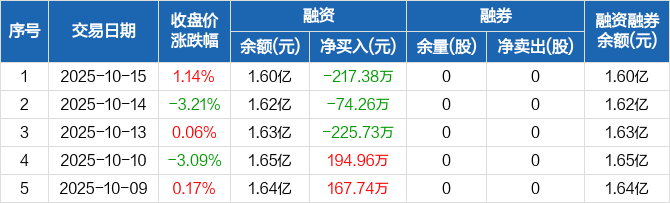 融资方面,当日融资买入360.72万元,融资偿还578.1万元,融资净偿还217.38万元,连续3日净偿还累计517.38万元。融券方面,融券卖出0股,融券偿还0股,融券余量0股,融券余额0元。融资融券余额合计1.6亿元。