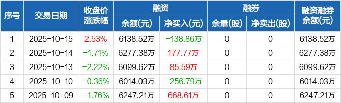 融资方面,当日融资买入318.83万元,融资偿还457.68万元,融资净偿还138.86万元。融券方面,融券卖出0股,融券偿还0股,融券余量0股,融券余额0元。融资融券余额合计6138.52万元。