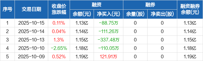 融资方面,当日融资买入281.08万元,融资偿还369.83万元,融资净偿还88.75万元,连续4日净偿还累计647.55万元。融券方面,融券卖出0股,融券偿还0股,融券余量0股,融券余额0元。融资融券余额合计1.13亿元。