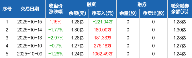 融资方面,当日融资买入331.01万元,融资偿还552.05万元,融资净偿还221.04万元。融券方面,融券卖出0股,融券偿还0股,融券余量0股,融券余额0元。融资融券余额合计1.28亿元。