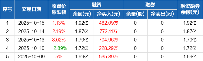 融资方面,当日融资买入1948.29万元,融资偿还1466.2万元,融资净买入482.09万元,连续6日净买入累计2931.44万元。融券方面,融券卖出0股,融券偿还0股,融券余量0股,融券余额0元。融资融券余额合计1.92亿元。
