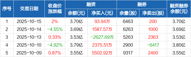 融资方面,当日融资买入1666.8万元,融资偿还1572.86万元,融资净买入93.94万元。融券方面,融券卖出200股,融券偿还0股,融券余量6463股,融券余额17.44万元。融资融券余额合计3.7亿元。